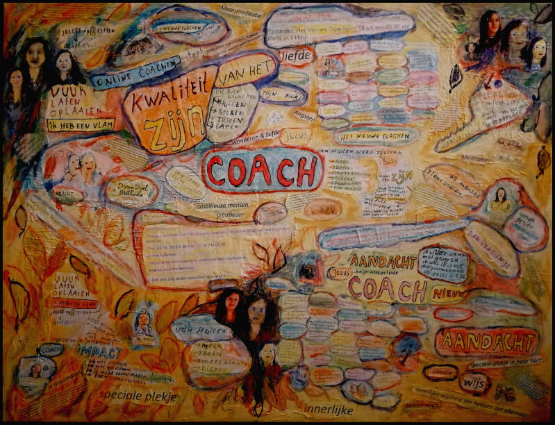 "DE NIEUWE COACH". Klik op het kunstwerk om een grotere versie te ontdekken. Tegenwoordig bestaan er nieuwe coachen die heel veel geld kunnen verdienen door online te gaan verkopen. Verschillende heb ik willen volgen en hier een voorbeeld van de nieuwe online coach