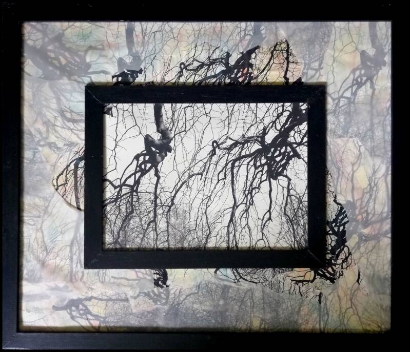 Materiaal fotografie-handafdruk met hout en verschillende technieken De naam van dit werk “Ingekaderde bomen” veranderde in 2021 in “BOOM VAN LEVEN”. DE BOOM VAN LEVEN staat symbool voor het leven dat we zouden moeten leven of vaak zouden willen leven. Het kunstwerk heeft zijn naam gekregen, na het ontstaan van de HIWI-drawing:BOOM VAN GOED EN KWAAD