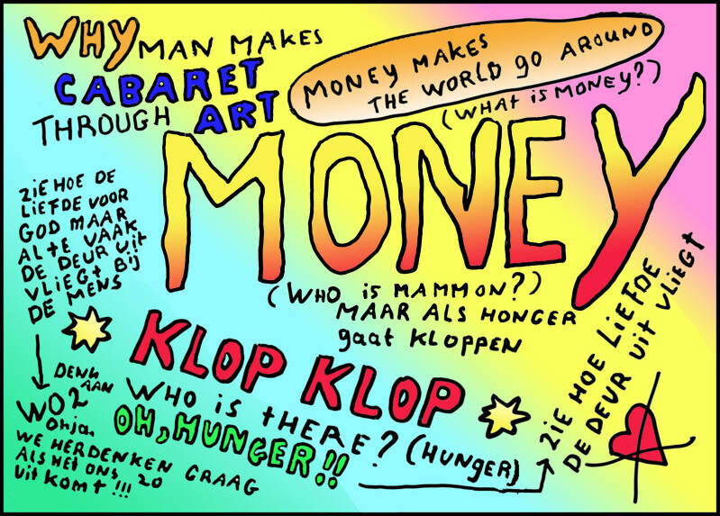 Of eigenlijk het onbewuste van de mens. Wetenschappelijk is aangetoond dat dit zelfs een percentage van 95% of zelfs nog meer zal zijn. Hierbij zien we dus een theater van iemand die de baas speelt over een slaaf. Dit wordt door mij naturlijk ook uitgebeeld door de 2 marionetten PIET en KAMEELHOND. Twee personages die een verijzing kennen naar Pozzo en Lucky uit het stuk WACHTEN OP GODOTH Wijze uitspraken blijken eveneens afkomstig te zijn uit de bijbel zoals waarbij je kunt denken aan de uitspraak: Zoek en je zult vinden
